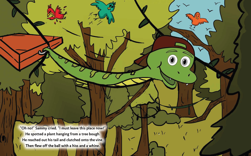 Sammy and the Wrecking Ball is a children’s book written by Marguerite Sansone and illustrated by Joe Bevill. Sammy is a snake who has a pretty nice lifestyle until a crane with a wrecking ball begins to demolish his little house. Sammy sadly leaves his wrecked home and realizes with dismay that the crane is following him. He runs headfirst into a tree and then ends up climbing up on the wrecking ball, thinking it’s a rock. Things just keep getting more and more complicated for this formerly happy-go-lucky reptile.